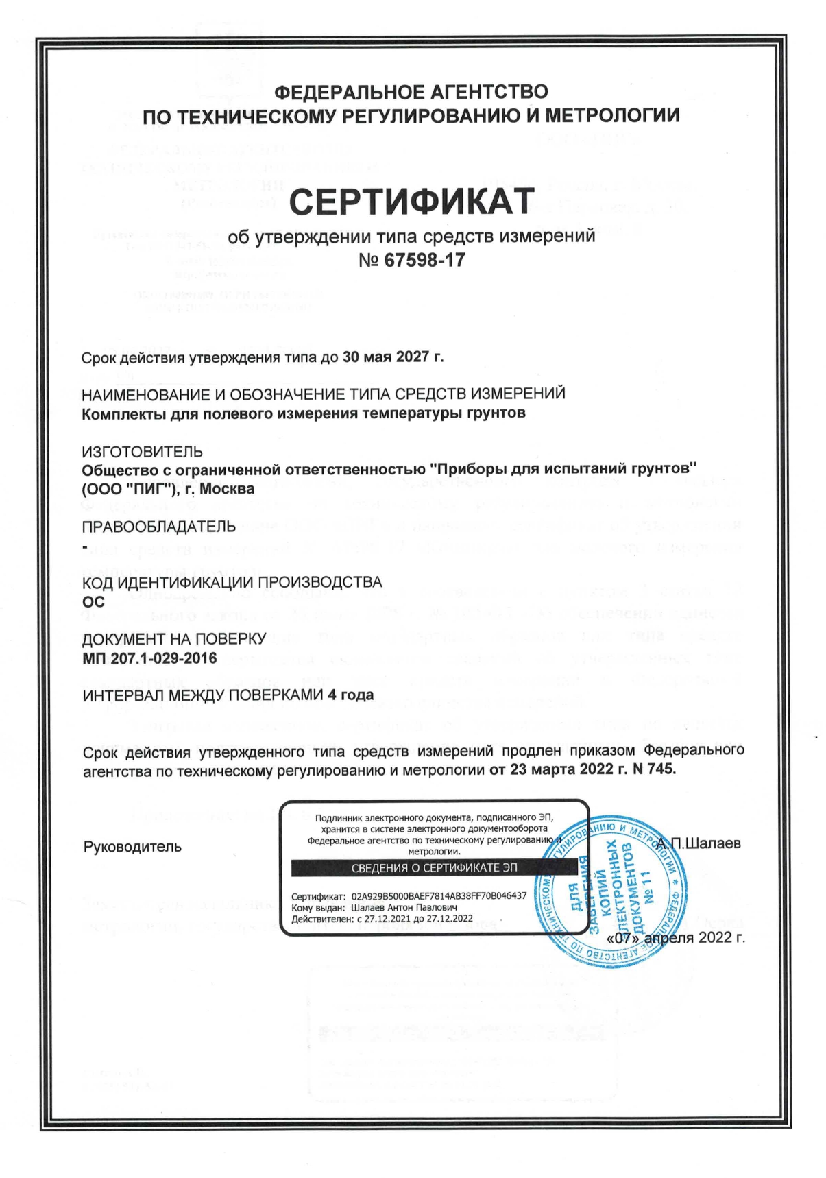 Получили сертификат о продлении утвержденного типа средств измерений на Комплекты для полевого измерения температуры грунтов производимых ООО "ПИГ", срок действия продлен до 2027 года. Сайт ООО "ПИГ" - https://pribori.my1.ru/